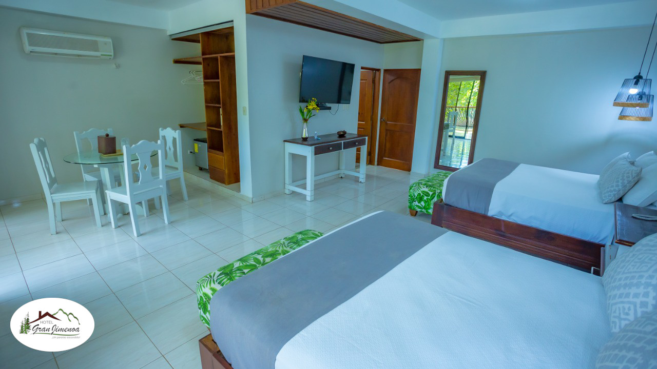 Our Junior Suite rooms have two queen-size beds, mini-dining room, cable TV, telephone, safe, air conditioning, executive refrigerator, hot/cold water in their bathrooms, and hair dryer, as well as a balcony with a view of the river.