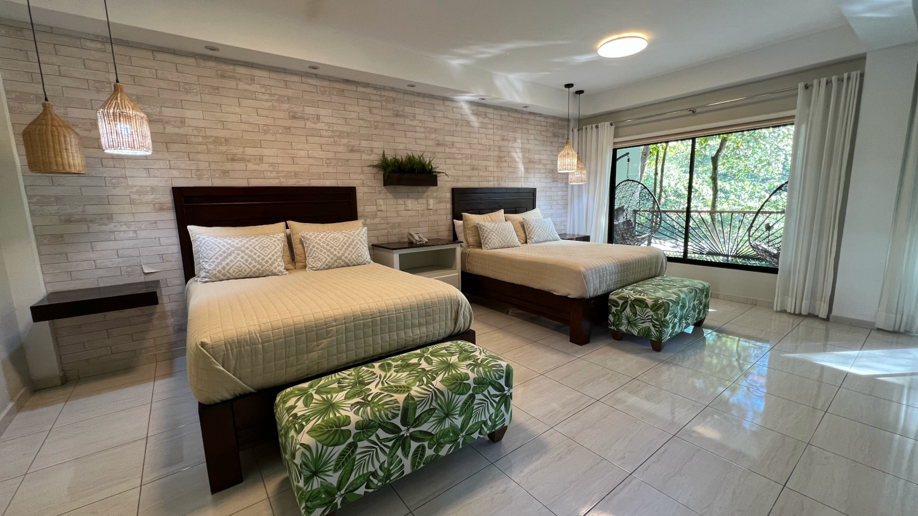 Our Deluxe rooms have two queen-size beds, cable TV, Wi-Fi internet, telephone, safe, air conditioning, hot/cold water and hair dryer, as well as a balcony overlooking the central garden.